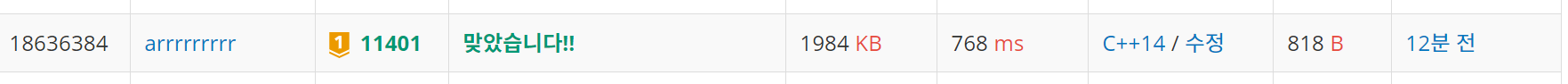 이항 계수 3 - 11401Algorithm/BOJ 2020. 3. 24. 00:21123456789101112131415161718192021222324252627282930313233343536373839404142434445464748//이항 계수 3 - 11401#include <iostream>using namespace std;int N, K;long long ans;const long long MOD = 1000000007;long long revM(int a){long long old_r, r, temp_r;long long old_s, s, temp_s;long long old_t, t, temp_t;long long q;old_r = a, r = MOD;old_s = 1, s = 0;old_t = 0, t = 1;while(r){q = old_r/r;temp_r = r;r = old_r - r*q;old_r = temp_r;temp_s = s;s = old_s - s*q;old_s = temp_s;temp_t = t;t = old_t - t*q;old_t = temp_t;}while(old_s < 0)old_s += MOD;return old_s;}int main(){cin >> N >> K;ans = 1;for(long long i = 1; i<=K; ++i)ans *= (N-i+1), ans %= MOD, ans *= revM(i), ans %= MOD;cout << ans;}