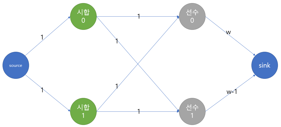 w를 최소의 크기로 잡고, 유량 알고리즘이 막힐때마다 선수들과 sink사이의 간선들의 capacity를 1씩 올려주어 최초로 source에서 나가는 간선의 capacity - flow가 모두 0이 되는 순간의 w가 답이 됩니다.